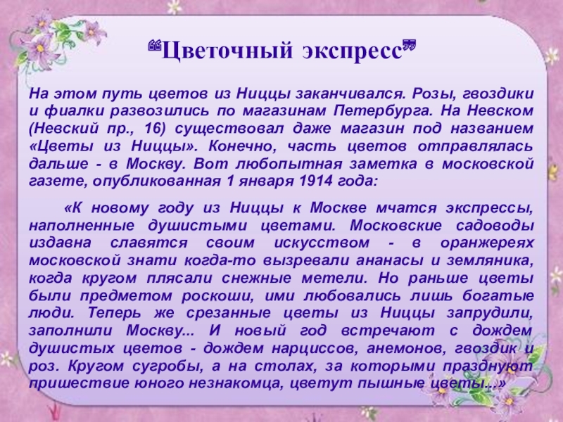 фиалки развозились по магазинам Петербурга. На Невском (Невский пр., 16) существовал даже магазин под названием «Цветы из Ниццы». Конечно, часть цветов отправлялась дальше - в Москву. Вот любопытная заметка в московской газете, опубликованная 1 января 1914 года: