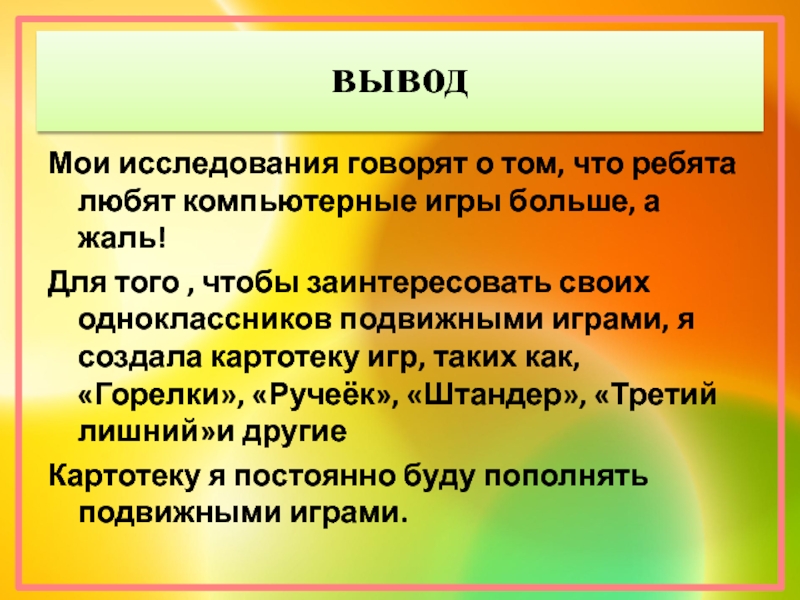 Переубедить сверстников играть в подвижные игры я решила при выполнении данной работы. Подвижная игра может быть средством развития, воспитания, развлечения, отдыха, спорта. Подвижные игры имеют оздоровительное, воспитательное и образовательное значение. Доказано, что они улучшают физическое развитие детей, благотворно воздействуют на нервную систему и укрепляют здоровье.