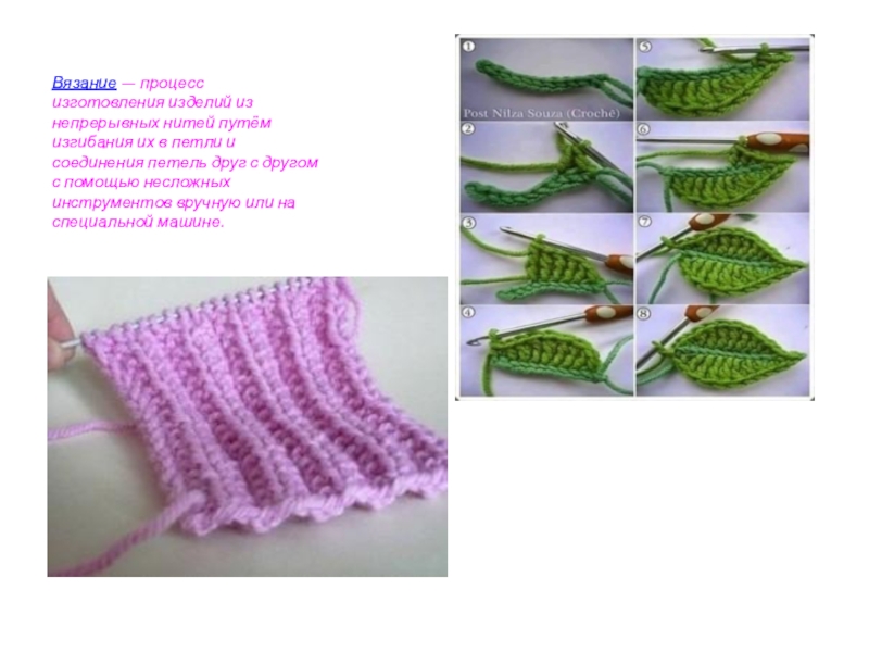 Слайд 18Вязание — процесс изготовления изделий из непрерывных нитей путём изгибания их в