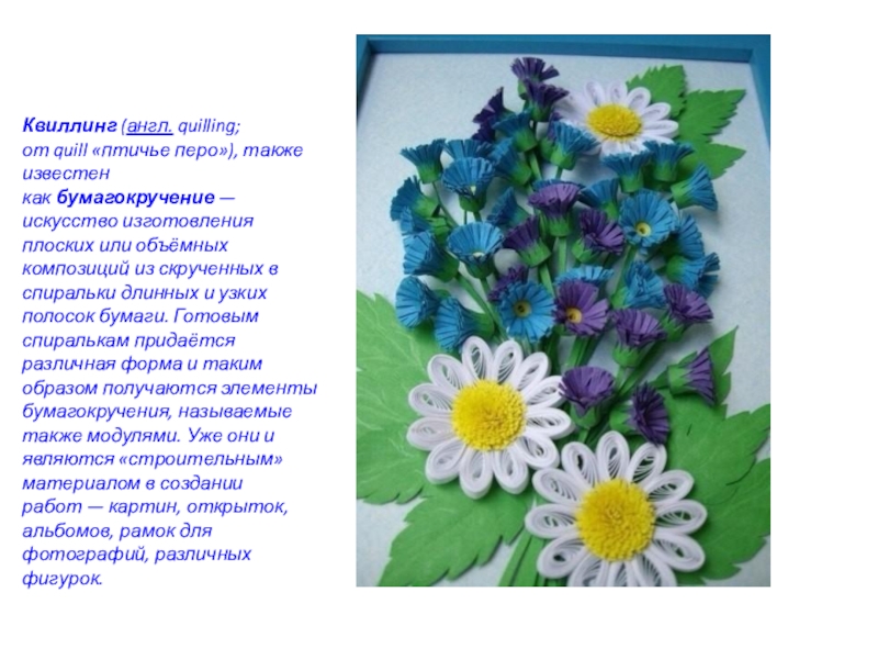 Слайд 17Квиллинг (англ. quilling; от quill «птичье перо»), также известен как бумагокручение — искусство изготовления плоских или объёмных композиций