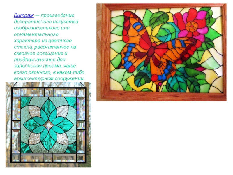 Слайд 19Витраж — произведение декоративного искусства изобразительного или орнаментального характера из цветного стекла,