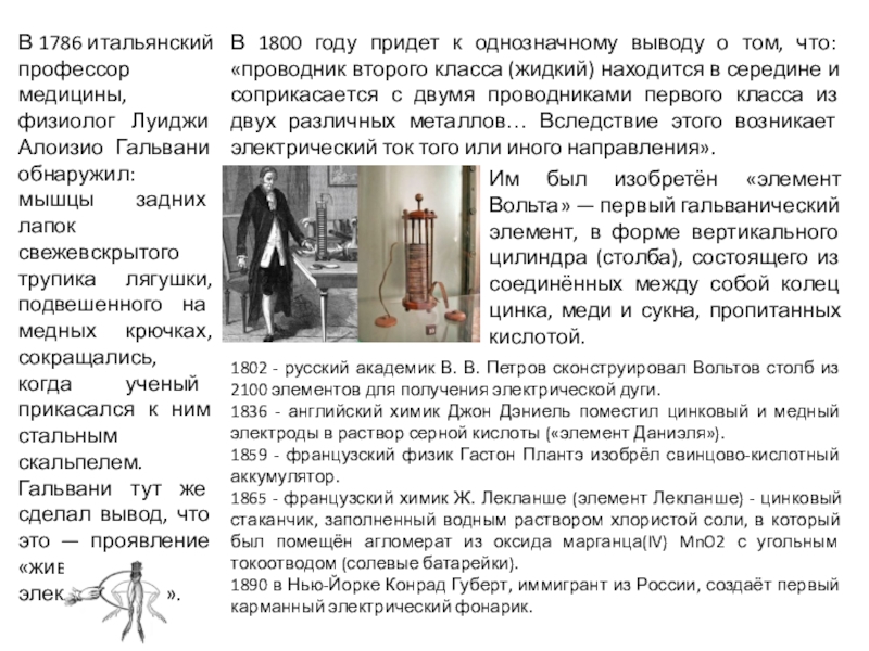 В 1800 году придет к однозначному выводу о том, что: «проводник второго класса (жидкий) находится в середине и соприкасается с двумя проводниками первого класса из двух различных металлов… Вследствие этого возникает электрический ток того или иного направления».