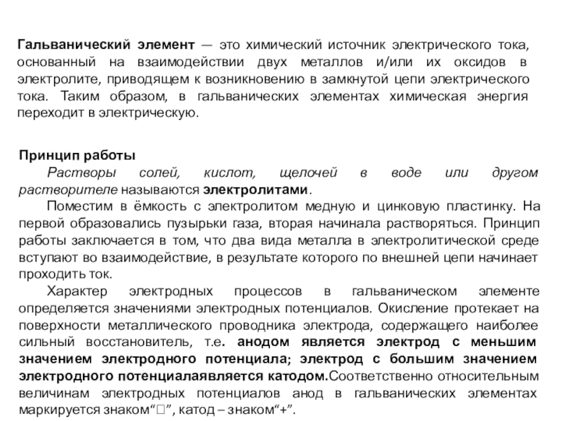 Гальванический элемент — это химический источник электрического тока, основанный на взаимодействии двух металлов и/или их оксидов в электролите, приводящем к возникновению в замкнутой цепи электрического тока. Таким образом, в гальванических элементах химическая энергия переходит в электрическую.