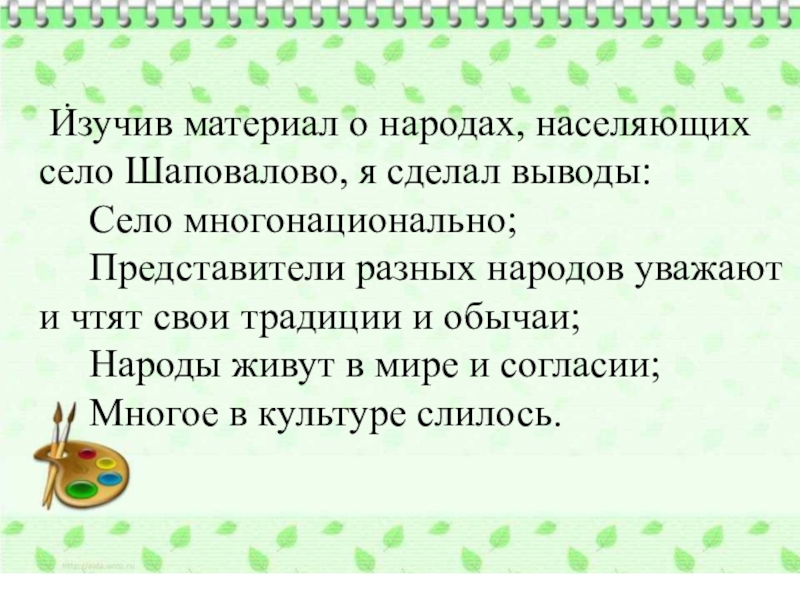 Изучив материал о народах, населяющих село Шаповалово, я сделал выводы: