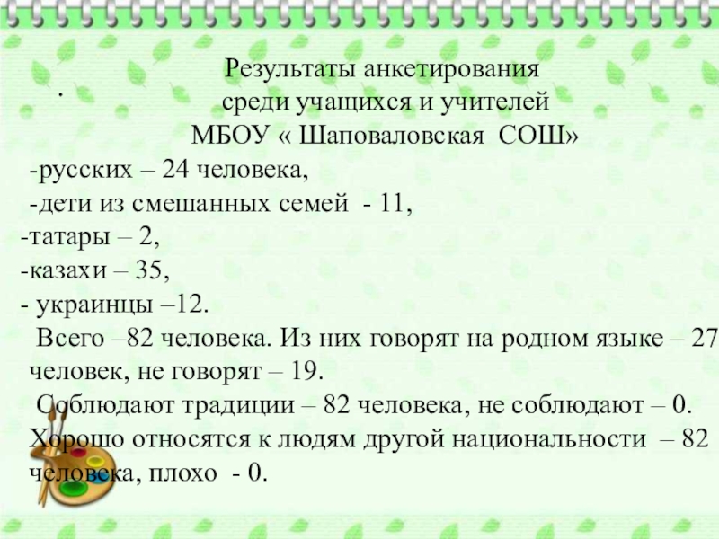 . Результаты анкетирования среди учащихся и учителей МБОУ « Шаповаловская СОШ» -русских – 24 человека, -дети из