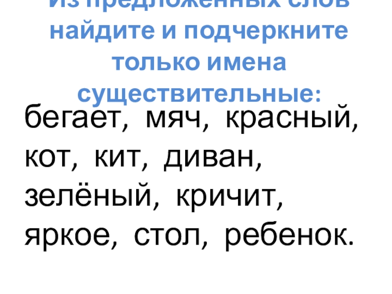 Из предложенных слов найдите и подчеркните только имена существительные:бегает, мяч, красный, кот, кит, диван, зелёный, кричит, яркое,