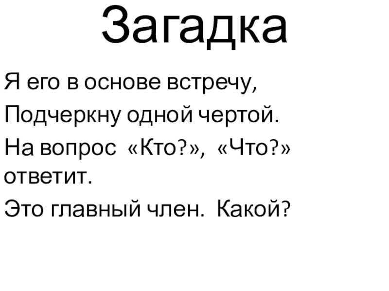 Загадка Я его в основе встречу, Подчеркну одной чертой.На вопрос «Кто?», «Что?» ответит.Это главный член. Какой?