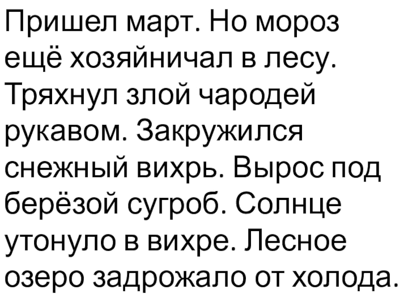 Пришел март. Но мороз ещё хозяйничал в лесу. Тряхнул злой чародей рукавом. Закружился снежный вихрь. Вырос под