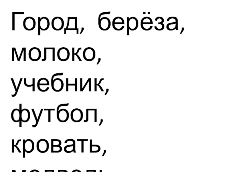 Слайд 13Город, берёза, молоко, учебник, футбол, кровать, медведь, портрет, класс.