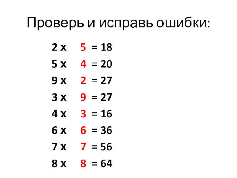 Проверь и исправь ошибки:2 х   5 = 185 х   4 = 209 х