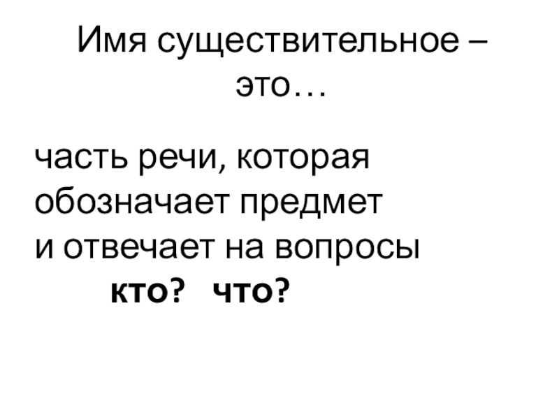 Имя существительное – это…часть речи, которая обозначает предмети отвечает на вопросы      кто?