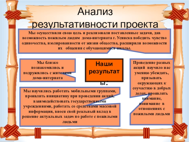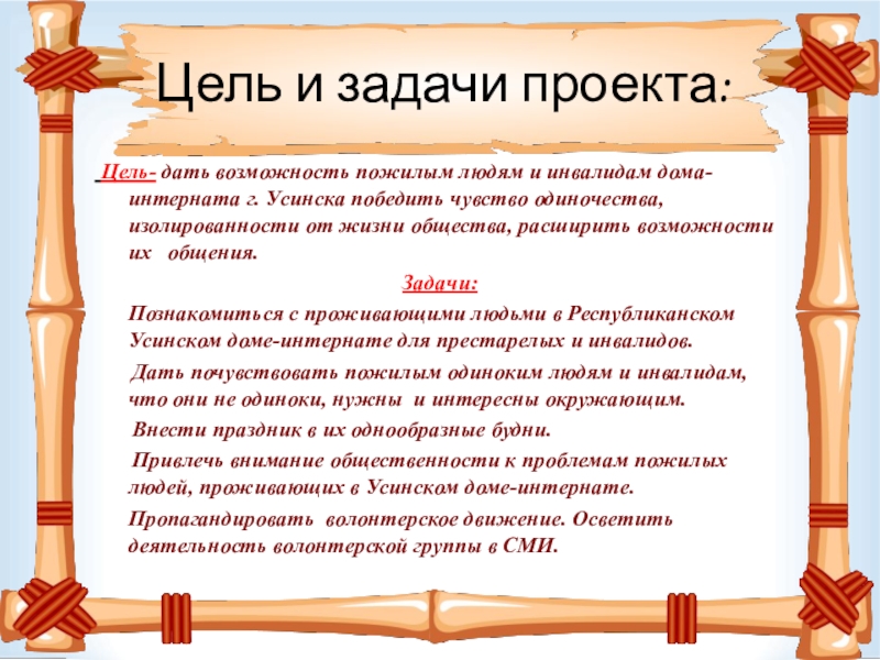 Мы осуществили свою цель и реализовали поставленные задачи, дав возможность пожилым людям дома-интерната г. Усинска победить чувство одиночества, изолированности от жизни общества, расширили возможности их общения с обучающимися школы.
