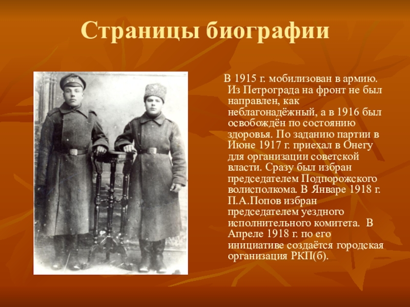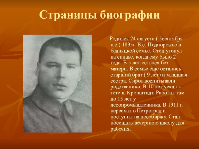 Родился 24 августа ( 5сентября н.с.) 1895г. В.с. Подпорожье в бедняцкой семье. Отец утонул на сплаве, когда ему было 2 года. В 5 лет остался без матери. В семье ещё остались старший брат ( 9 лет) и младшая сестра. Сирот воспитывали родственики. В 10 лет уехал к тёте в. Кронштадт. Работал там до 15 лет у лесопромышленника. В 1911 г. переехал в Петроград и поступил на лесобиржу. Стал посещать вечернюю школу для рабочих.