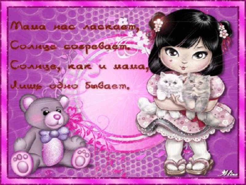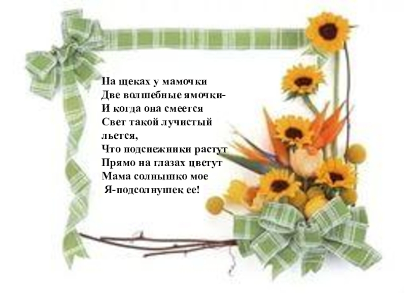 На щеках у мамочкиДве волшебные ямочки-И когда она смеетсяСвет такой лучистый льется,Что подснежники растутПрямо на глазах цветутМама солнышко мое Я-подсолнушек ее!