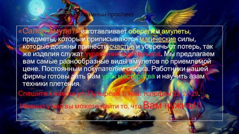 «Салон Амулет» изготавливает обереги и амулеты, предметы, которым приписываются магические силы, которые должны принести счастье и уберечь от потерь, так же изделия служат украшением интерьера. Мы предлагаем вам самые разнообразные виды амулетов по приемлемой цене. Постоянным покупателям скидка. Работники нашей фирмы готовы дать Вам урок мастерства и научить азам техники плетения.