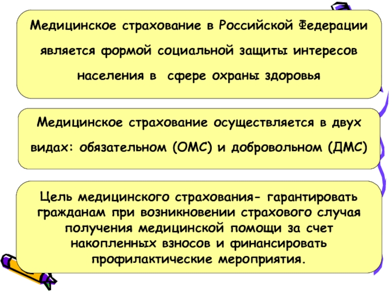 Цель медицинского страхования- гарантировать гражданам при возникновении страхового случая получения медицинской помощи за счет накопленных взносов и финансировать профилактические мероприятия.