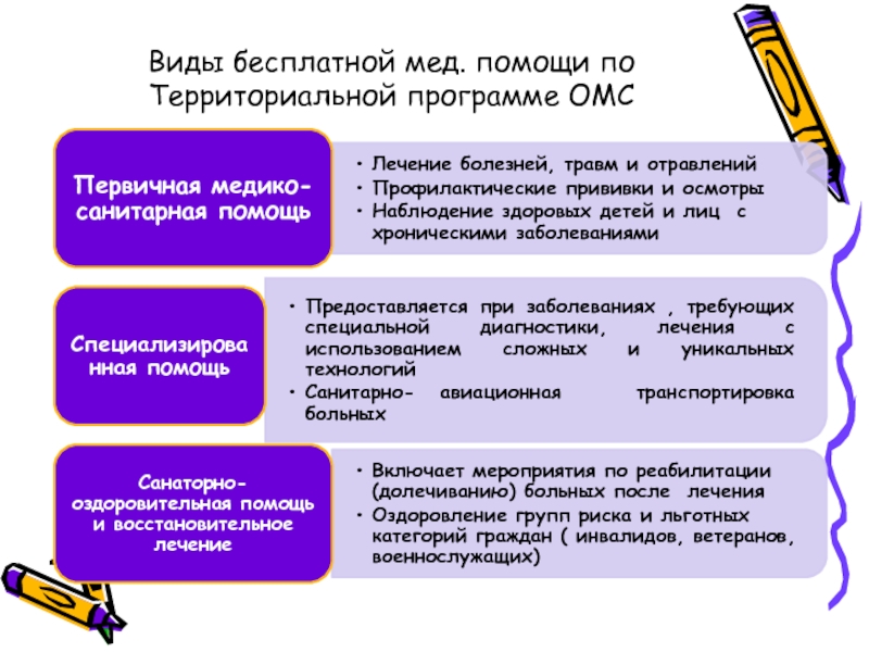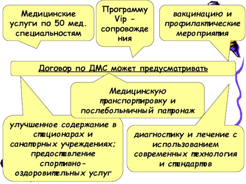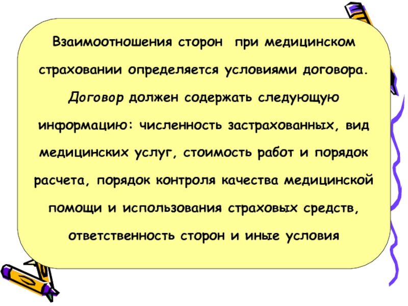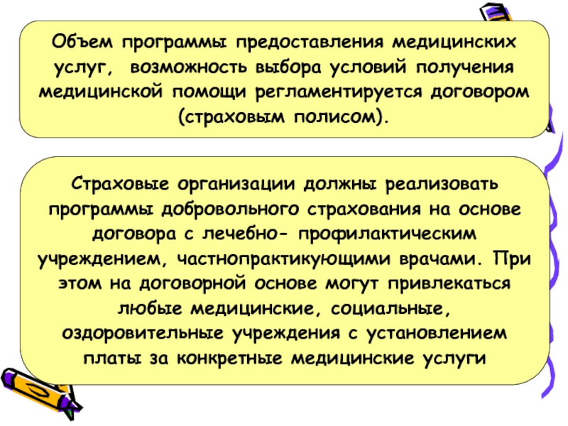 Страховые организации должны реализовать программы добровольного страхования на основе договора с лечебно- профилактическим учреждением, частнопрактикующими врачами. При этом на договорной основе могут привлекаться любые медицинские, социальные, оздоровительные учреждения с установлением платы за конкретные медицинские услуги