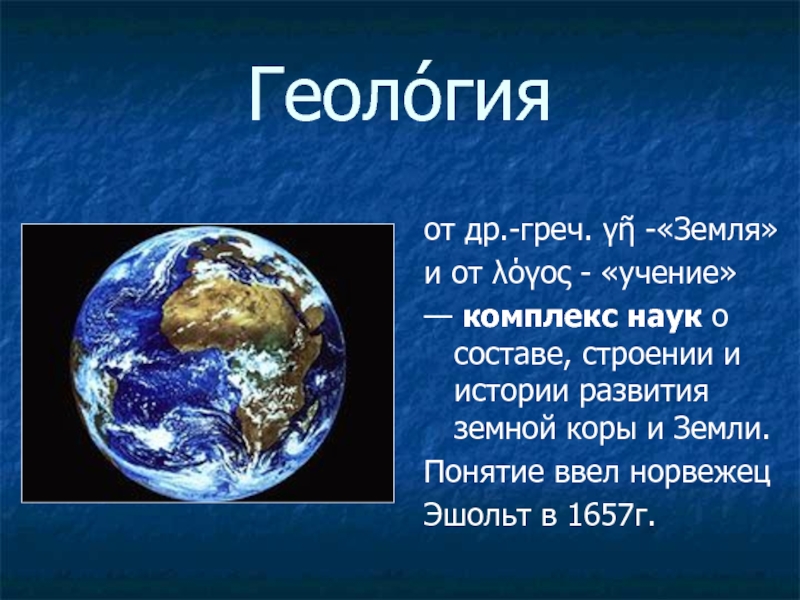 Геоло́гияот др.-греч. γῆ -«Земля»и от λόγος - «учение» — комплекс наук о составе, строении и истории развития земной коры и Земли. Понятие ввел норвежец Эшольт в 1657г.