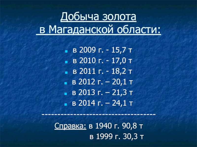 Слайд 13Добыча золота в Магаданской области: