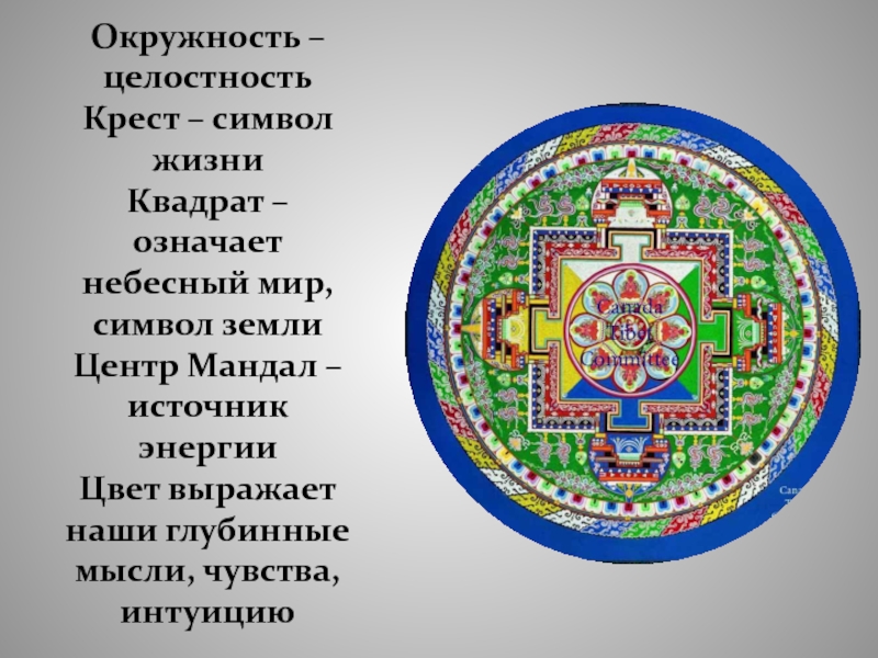 Окружность – целостность Крест – символ жизни Квадрат – означает небесный мир, символ земли Центр Мандал –