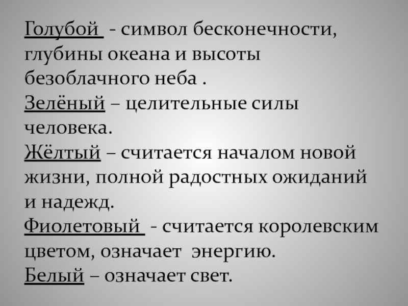 Слайд 19Голубой - символ бесконечности, глубины океана и высоты безоблачного неба .