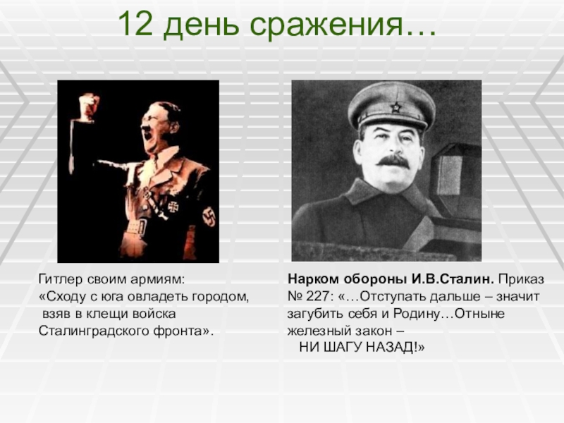 Нарком обороны И.В.Сталин. Приказ № 227: «…Отступать дальше – значит загубить себя и Родину…Отныне железный закон –