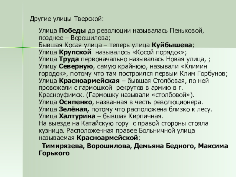 Тимирязева, Ворошилова, Демьяна Бедного, Максима Горького