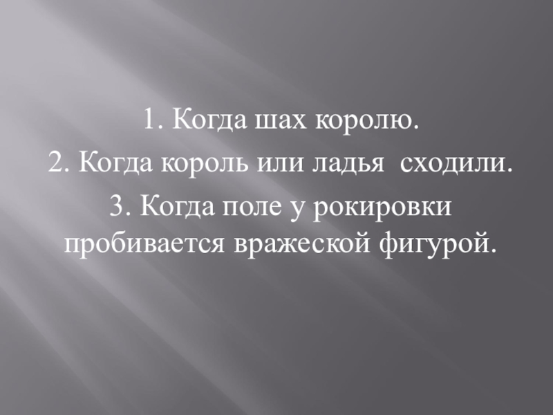 1. Когда шах королю.2. Когда король или ладья сходили.3. Когда поле у рокировки пробивается вражеской фигурой.