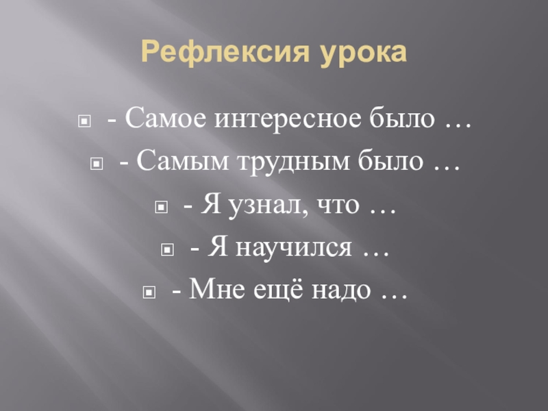 Рефлексия урока- Самое интересное было …- Самым трудным было …- Я узнал, что …- Я научился …-