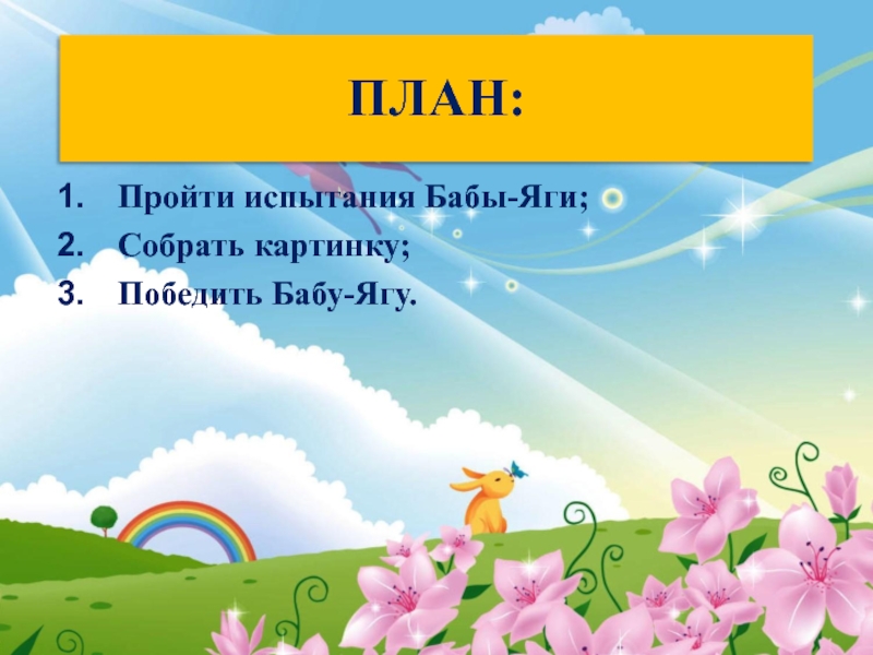 ПЛАН:1. Пройти испытания Бабы Яги; 2. Собрать картинку;3. Победить Бабу Ягу.