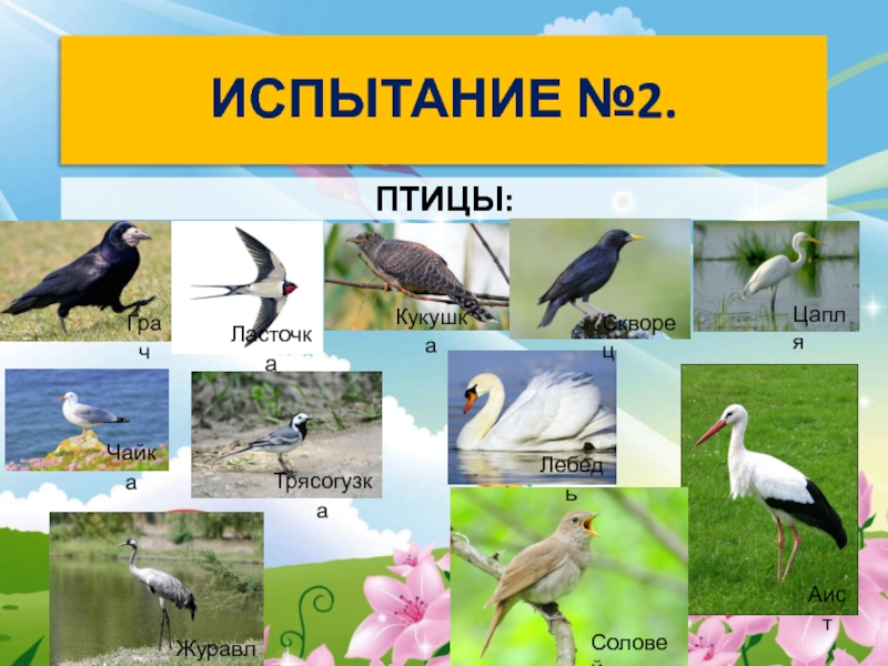 ИСПЫТАНИЕ №2.ПТИЦЫ:ЧайкаГрачЛасточкаКукушкаСкворецЦапляТрясогузкаЛебедьСоловейАистЖуравль