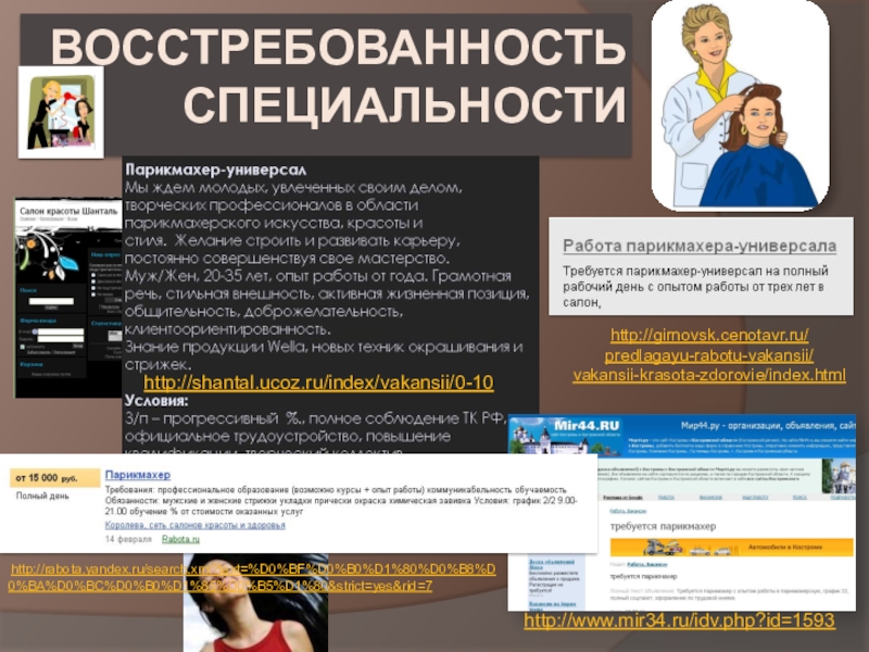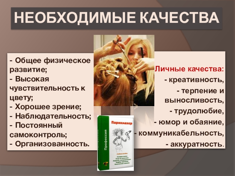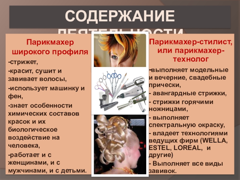 - владеет технологиями ведущих фирм (WELLA, ESTEL, LOREAL, и другие)