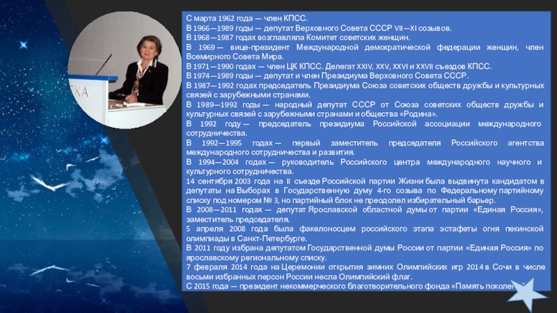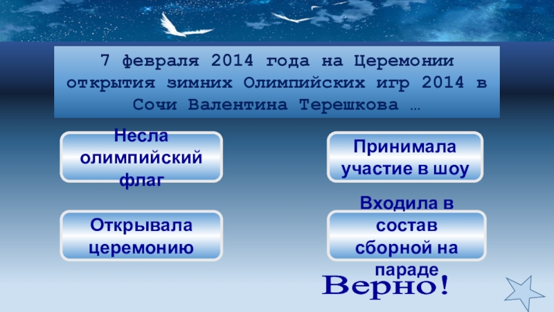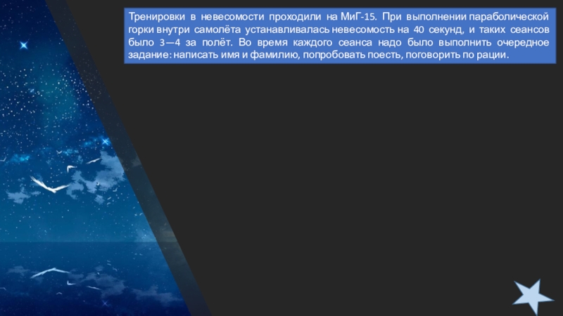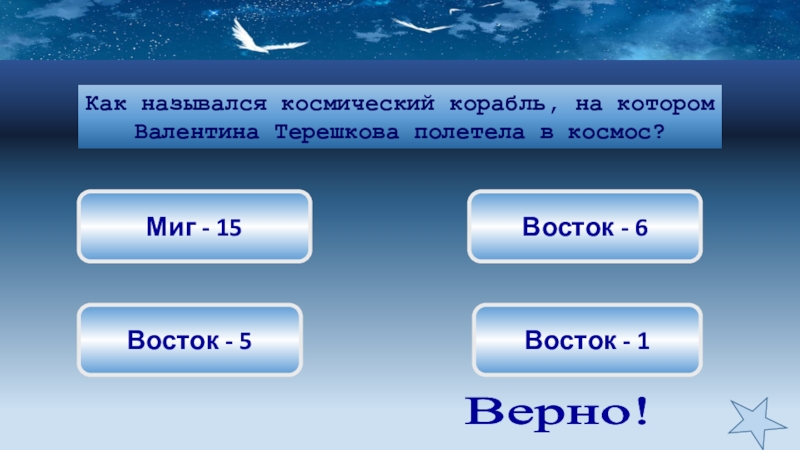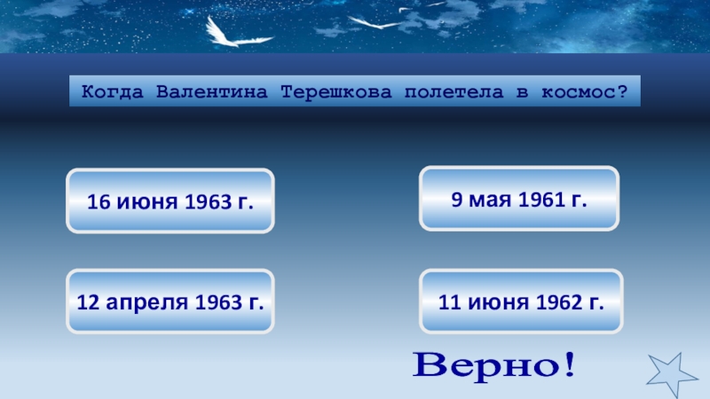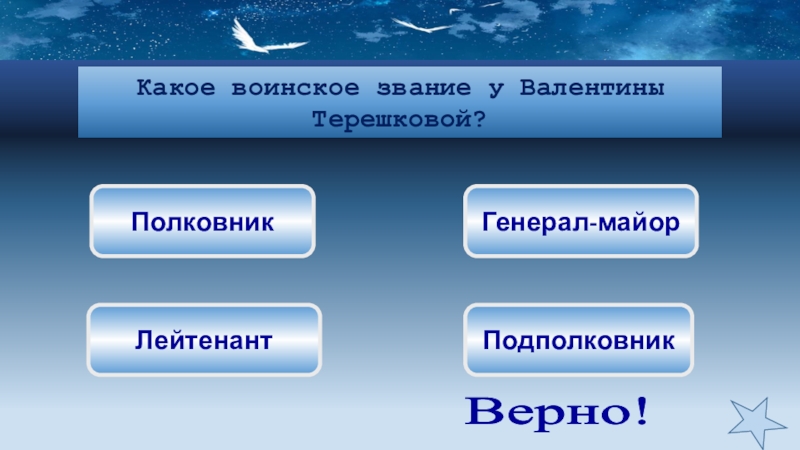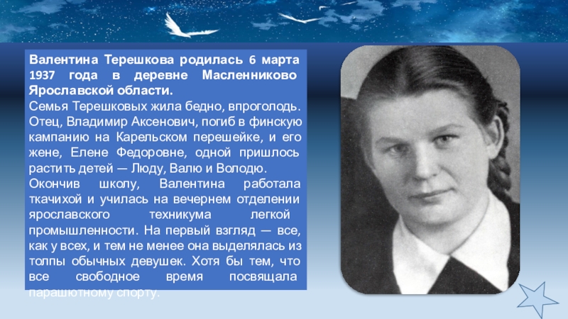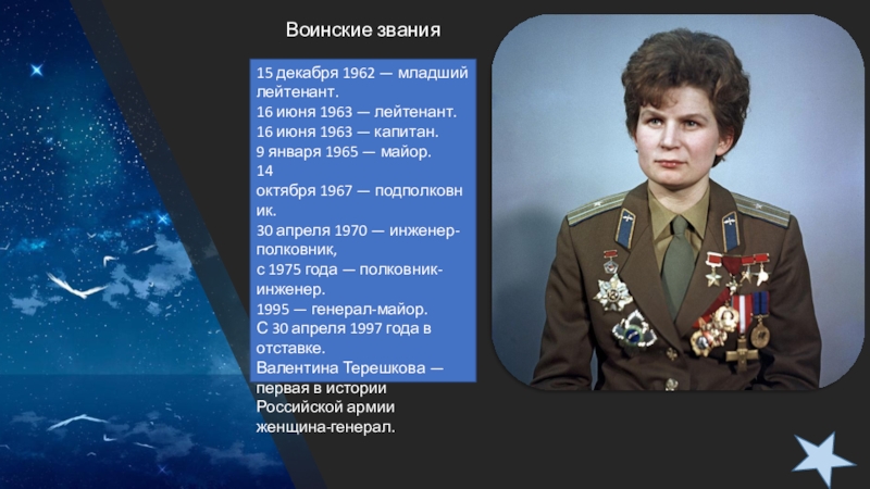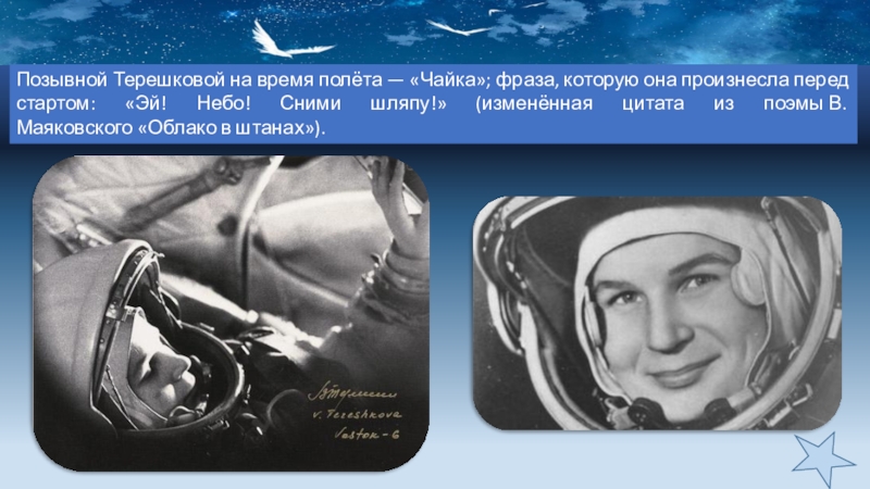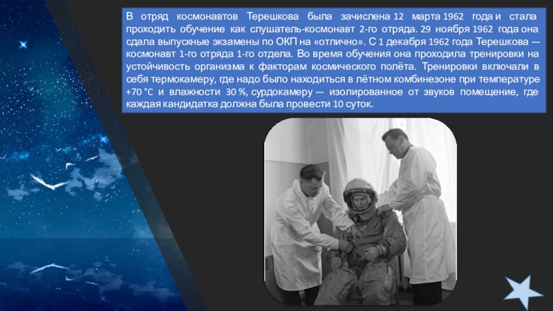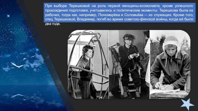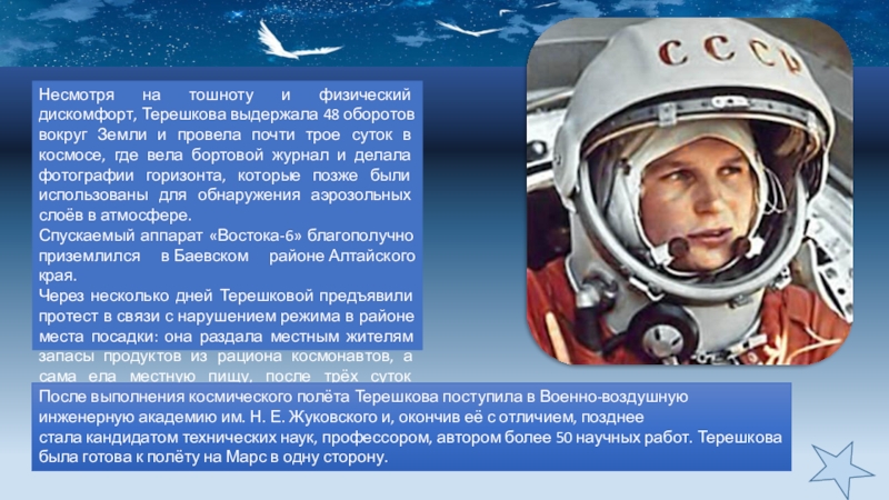 После выполнения космического полёта Терешкова поступила в Военно-воздушную инженерную академию им. Н. Е. Жуковского и, окончив её с отличием, позднее стала кандидатом технических наук, профессором, автором более 50 научных работ. Терешкова была готова к полёту на Марс в одну сторону.