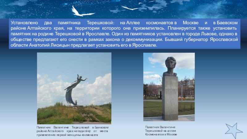 Памятник Валентине Терешковой на аллее Космонавтов в Москве