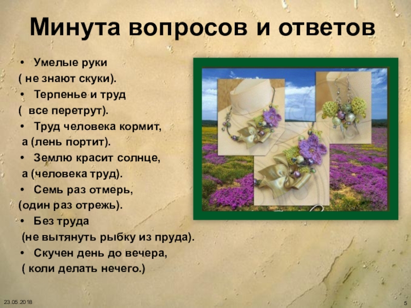 Минута вопросов и ответовУмелые руки      ( не знают скуки).Терпенье и труд( все