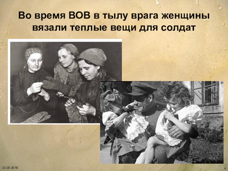 Слайд 4Во время ВОВ в тылу врага женщины вязали теплые вещи для