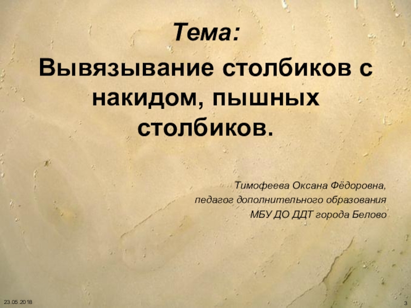 Тема: Вывязывание столбиков с накидом, пышных столбиков.Тимофеева Оксана Фёдоровна, педагог дополнительного образованияМБУ ДО ДДТ города Белово