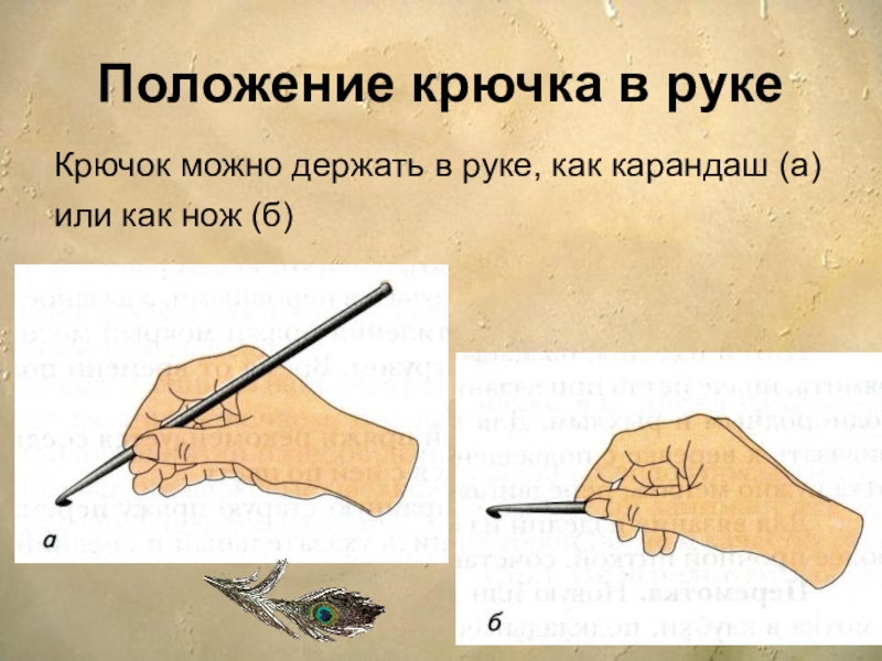 Положение крючка в руке  Крючок можно держать в руке, как карандаш (а)  или как нож