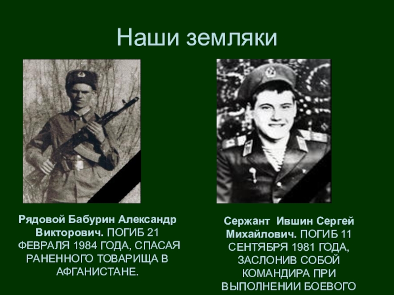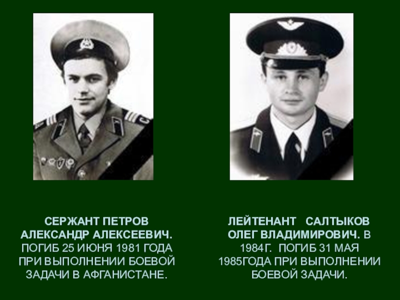 ЛЕЙТЕНАНТ САЛТЫКОВ ОЛЕГ ВЛАДИМИРОВИЧ. В 1984Г. ПОГИБ 31 МАЯ 1985ГОДА ПРИ ВЫПОЛНЕНИИ БОЕВОЙ ЗАДАЧИ.