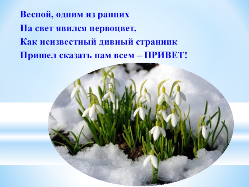 Весной, одним из раннихНа свет явился первоцвет.Как неизвестный дивный странникПришел сказать нам всем – ПРИВЕТ!