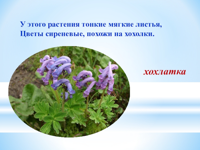 У этого растения тонкие мягкие листья,Цветы сиреневые, похожи на хохолки.хохлатка