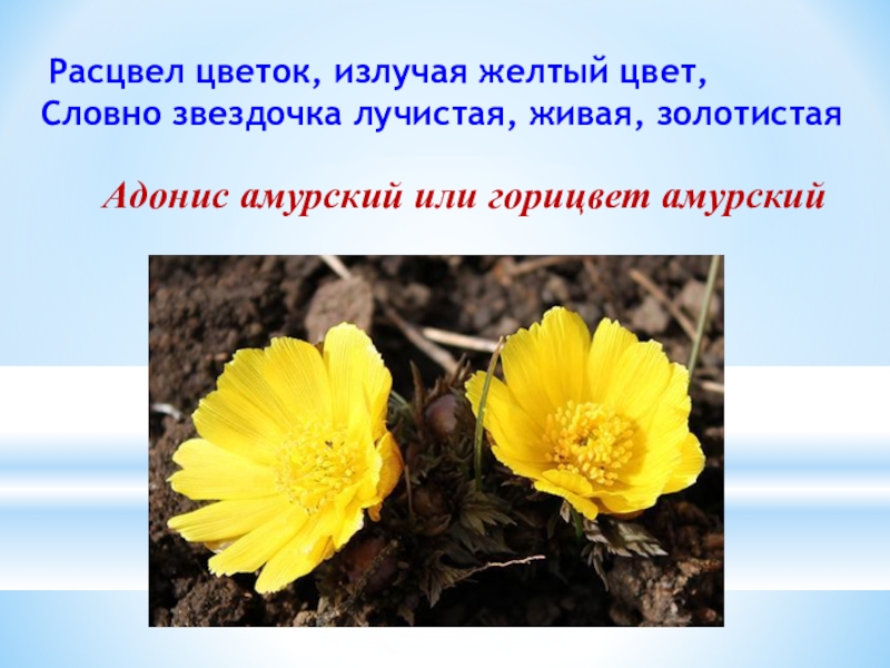 Расцвел цветок, излучая желтый цвет,Словно звездочка лучистая, живая, золотистаяАдонис амурский или горицвет амурский