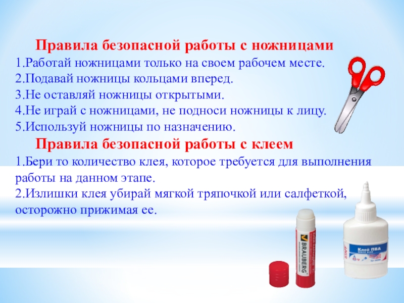 Правила безопасной работы с ножницами1.Работай ножницами только на своем рабочем месте.2.Подавай ножницы кольцами вперед.3.Не оставляй ножницы открытыми.4.Не
