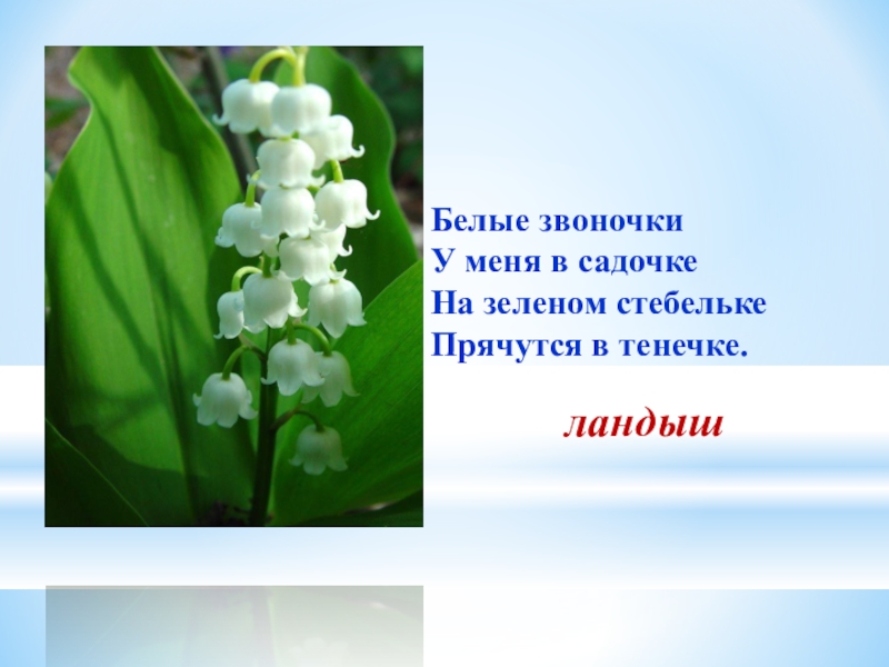 Белые звоночкиУ меня в садочкеНа зеленом стебелькеПрячутся в тенечке.ландыш