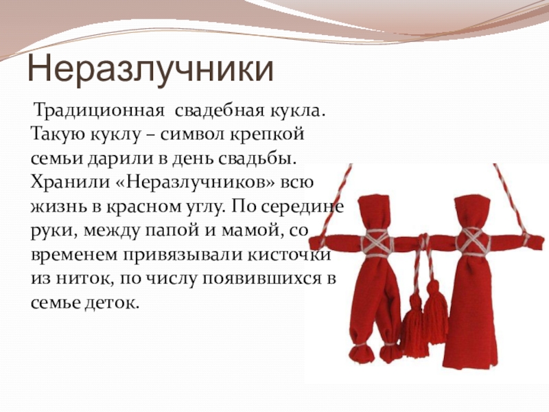 дарили в день свадьбы. Хранили «Неразлучников» всю жизнь в красном углу. По середине руки, между папой и мамой, со временем привязывали кисточки из ниток, по числу появившихся в семье деток.