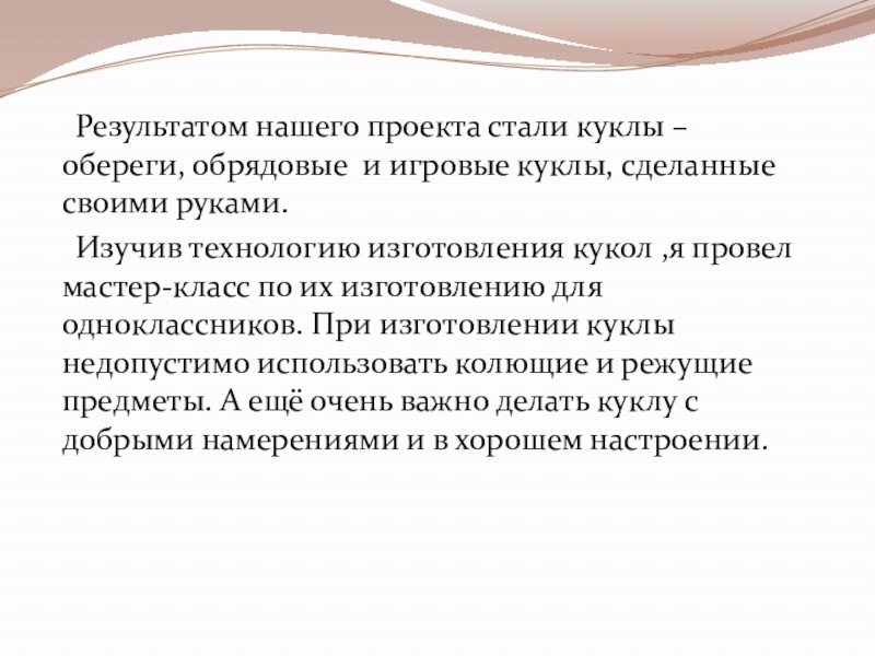 Слайд 17 Результатом нашего проекта стали куклы – обереги, обрядовые