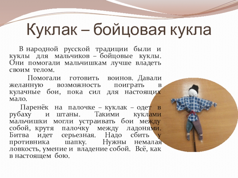 традиции были и куклы для мальчиков – бойцовые куклы. Они помогали мальчишкам лучше владеть своим телом.