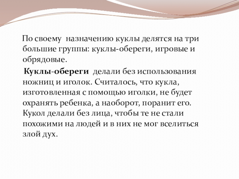 Слайд 6 По своему назначению куклы делятся на три большие группы:
