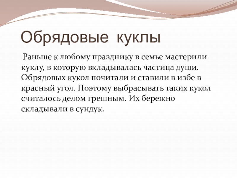 в которую вкладывалась частица души. Обрядовых кукол почитали и ставили в избе в красный угол. Поэтому выбрасывать таких кукол считалось делом грешным. Их бережно складывали в сундук.