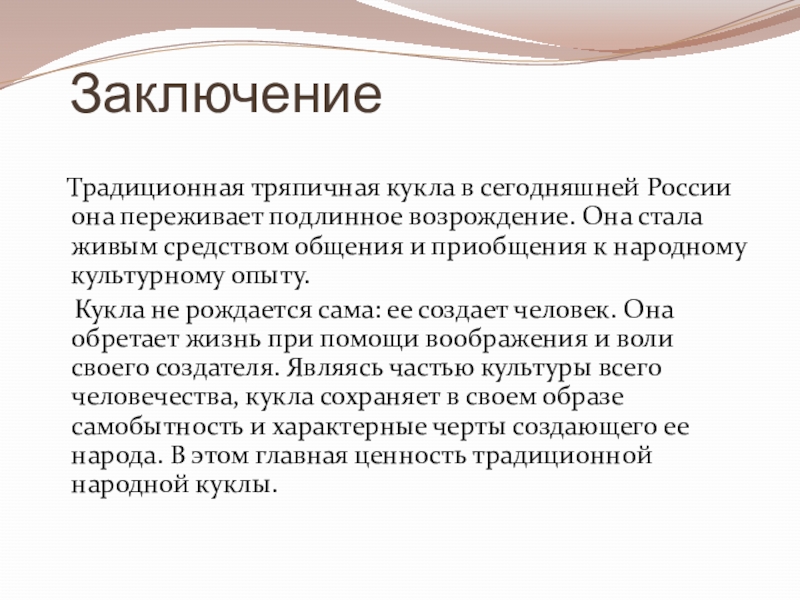 Кукла не рождается сама: ее создает человек. Она обретает жизнь при помощи воображения и воли своего создателя. Являясь частью культуры всего человечества, кукла сохраняет в своем образе самобытность и характерные черты создающего ее народа. В этом главная ценность традиционной народной куклы.